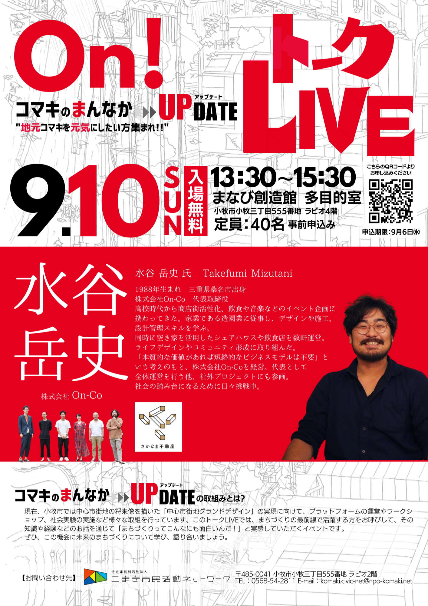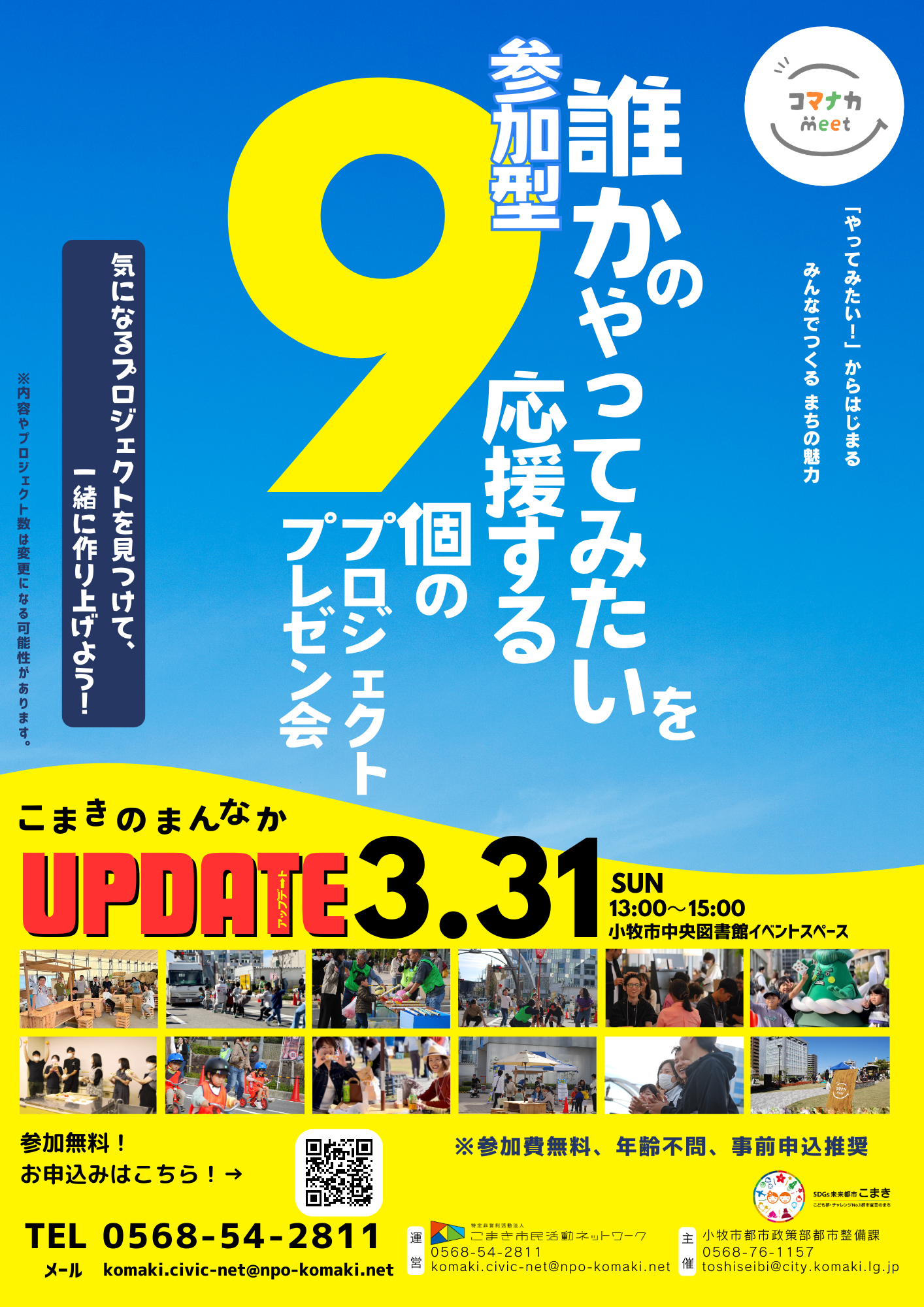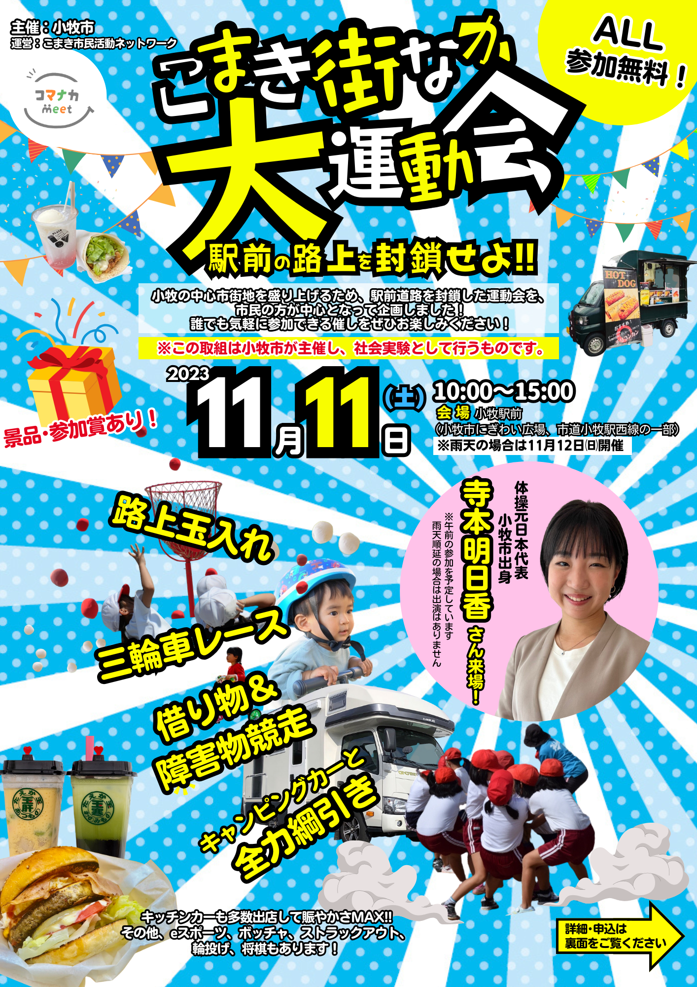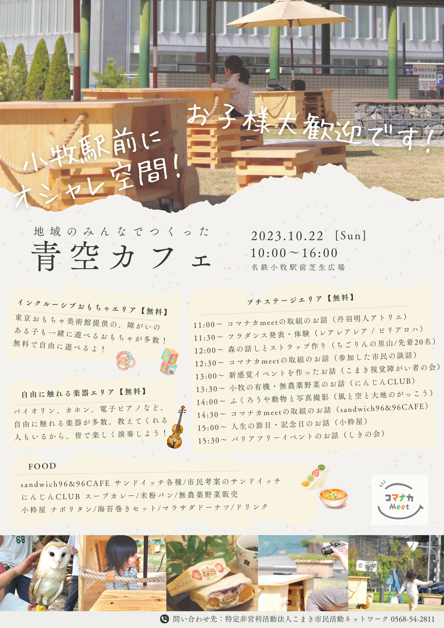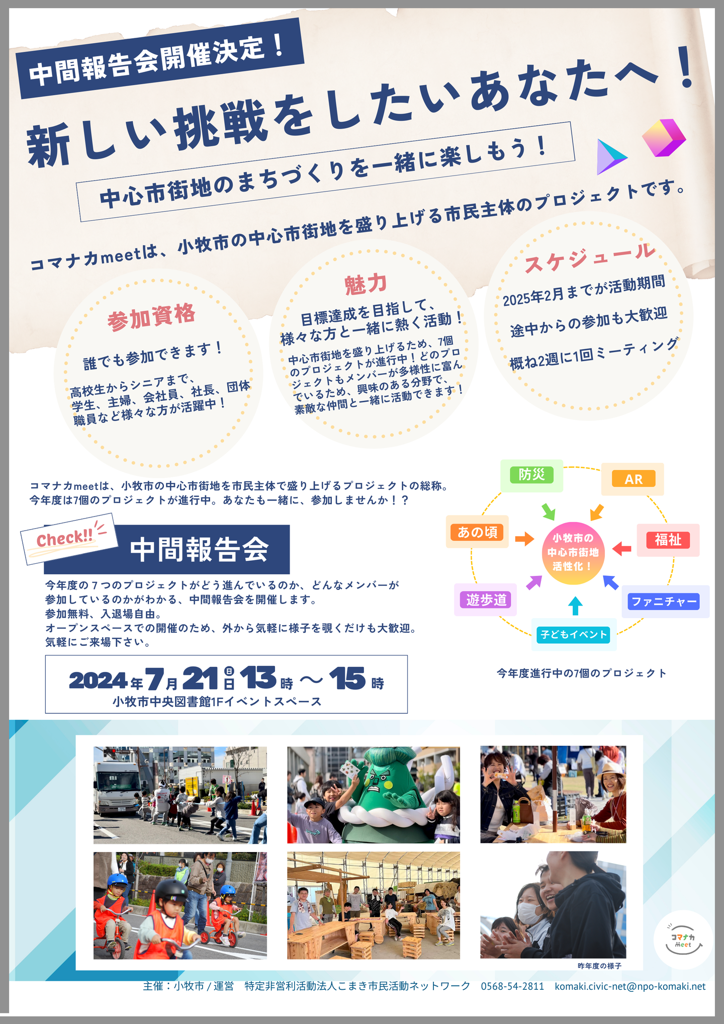 いよいよ開催!プロジェクトプレゼン会! 今年度進行中のプロジェクトの生の声と現状が手に取るようにわかる、第1回中間報告会を開催します。どんなメンバーが参加しているの?どんな企画として進んでいるの?などなど、気になることはここで解決!事前申し込み不要、参加費無料なので、お気軽にご参加ください!【詳しくはこちら】 いよいよ開催!プロジェクトプレゼン会! 愛知県小牧市の中心市街地を盛り上げる、2024年の9つのプロジェクトを大発表!気になるプロジェクトを見つけて、一緒に作ろう!皆様のご参加お待ちしています!【詳しくはこちら】 【終了】高校生レストランの仕掛人、岸川政之さんを招いて講演会を開催! 日時:2023年11月18日(土)13:30~15:30 場所:ワクティブこまき多目的室( 小牧市小牧三丁目555番地 ラピオ2階) テーマ:未来へ繋げる持続可能なまちづくり~高校生レストランの奇跡~ 【詳しくはこちら】 【終了】こまき街なか大運動会 日時:2023年11月11日(土)10:00~15:00 場所:にぎわい広場、市道小牧駅西線(愛知県小牧市、名鉄小牧駅前) 【詳しくはこちら】 【終了】地域のみんなでつくった「青空カフェ」 日時:2023年10月22日(日)10:00~16:00 場所:小牧市にぎわい広場A、B、C区画(愛知県小牧市、名鉄小牧駅前芝生広場) 【詳しくはこちら】 【終了】地方創成に関するプロジェクトに多く関わる荒井慶悟さんを招いてワークショップを開催! 日時:2023年10月7日(土)13:30~15:30 場所:小牧市中央図書館1階イベントスペース(愛知県小牧市中央一丁目234) テーマ:トライ&エラーから生まれる本当のつながり 【詳しくはこちら】 【終了】さかさま不動産の水谷様を招いての講演・WSを開催! メディアなどでも有名なさかさま不動産の水谷様を招いてのイベントです! 是非ご参加下さい! 日時:2023年9月10日(土)13:30~15:30 場所:小牧市ラピオ4階 テーマ:とりあえず、やってみよう!僕が見ているちょっと違った世界の話~新しい価値創造の追及へ~」 【詳しくはこちら】
